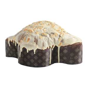 La Colomba Oro Bianco è ricoperta da uno strato di cioccolato bianco e scaglie di mandorle. Viene fornita con un vasetto di crema di mandorle e un pratico coltellino per applicare la crema alla colomba.