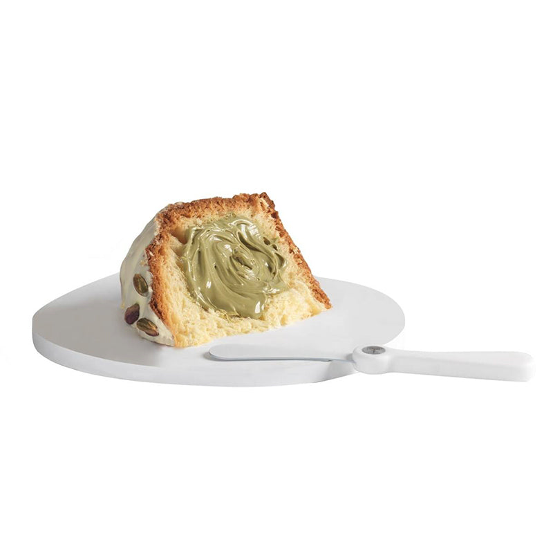 Die Colomba Oro Verde ist mit einer weissen Schokoladenschicht und Pistazienstücken überzogen. Dazu kommt ein Glas Pistaziencreme und ein praktisches Messerchen, um die Creme auf die Colomba aufzutragen.