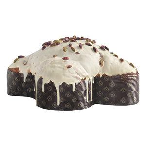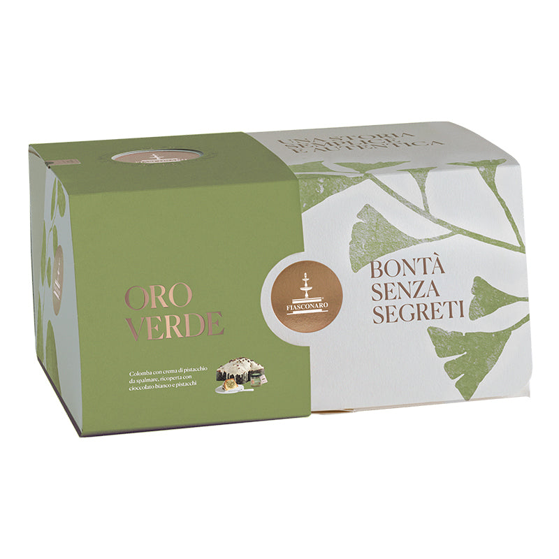 221001KADie Colomba Oro Verde ist mit einer weissen Schokoladenschicht und Pistazienstücken überzogen. Dazu kommt ein Glas Pistaziencreme und ein praktisches Messerchen, um die Creme auf die Colomba aufzutragen.