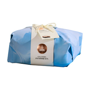 Colomba senza uva sultanina e frutta candita, ricoperta di glassa e zucchero a velo.