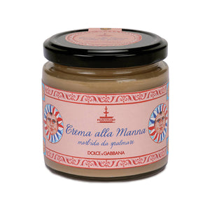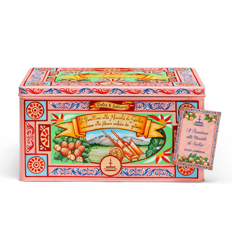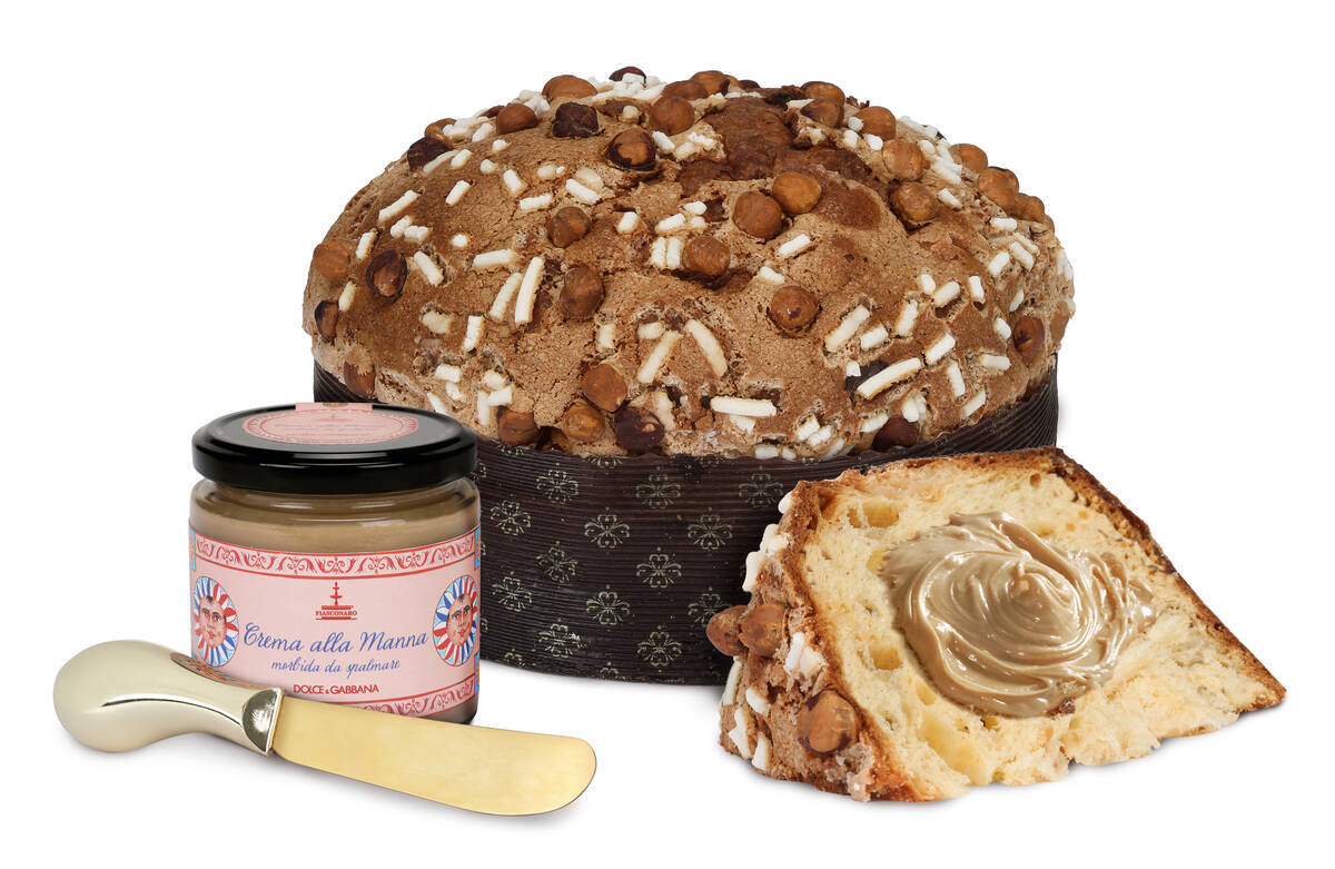 Panettone mit sizilianischen Haselnüssen. Dazu kommt ein Glas Manna-Creme und ein praktisches Messerchen, um die Creme auf den Panettone aufzutragen. Verpackt in einer eleganten, von Dolce & Gabbana gestalteten Dose. Hinzu kommt zu jedem Panettone eine hochwertige D&G Tragtasche im einzigartigen Design.