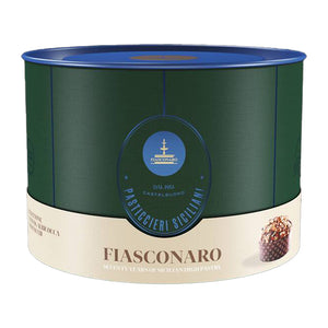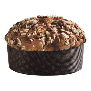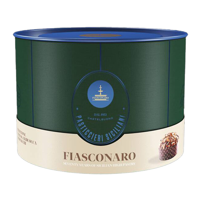 Panettone con pezzi di ananas e albicocche candite, ricoperto di glassa e pistacchi.