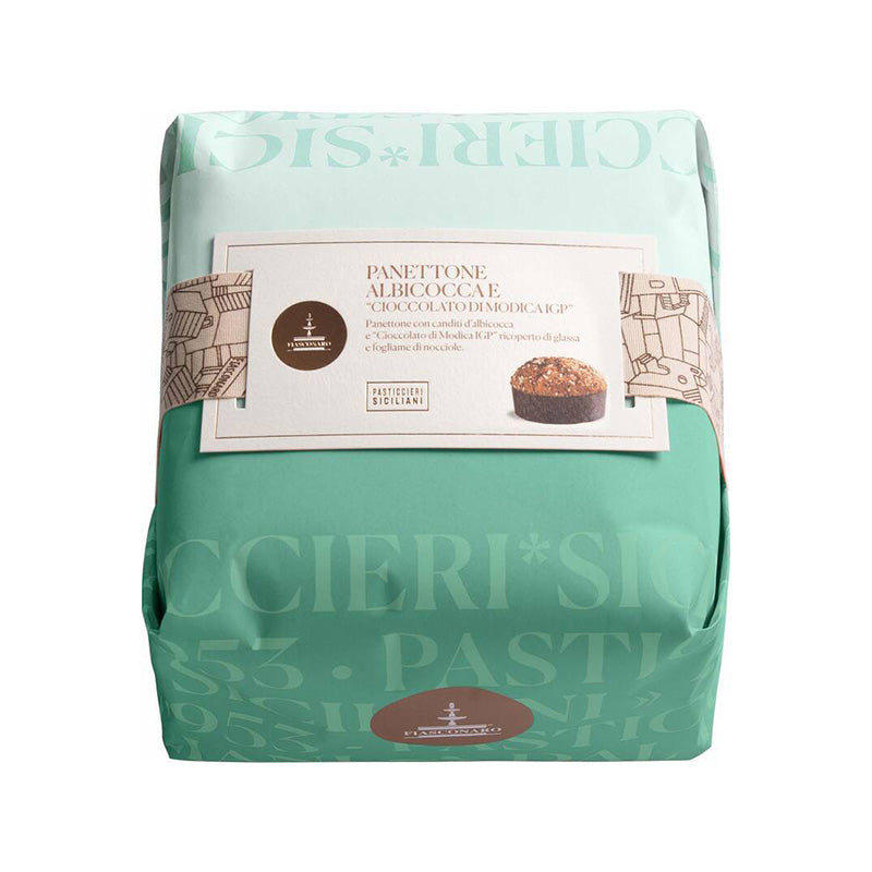 Panettone con gocce di cioccolato di Modica e albicocche candite, ricoperto di glassa e nocciole scagliate.