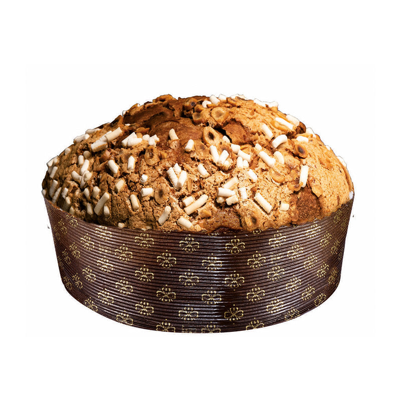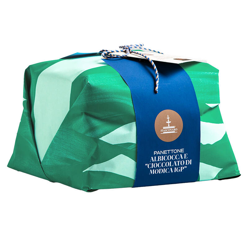 Panettone avec des pépites de chocolat de Modica et des abricots confits, recouvert de glaçage et de noisettes rabotées.