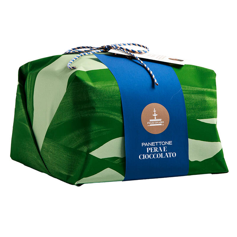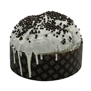 Panettone con gocce di cioccolato e pere candite, ricoperto di cioccolato bianco e perle di cioccolato.