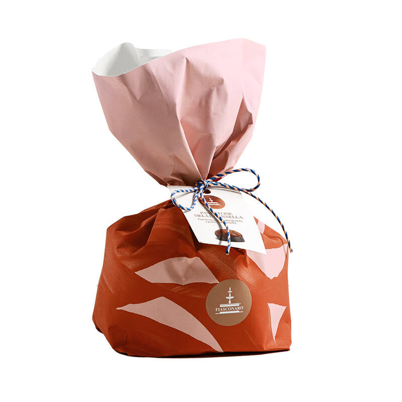 Der Panettone-Teig ist mit kandierte Apfelstücke und Zimt, ohne Glasur. Verpackt.