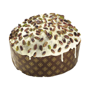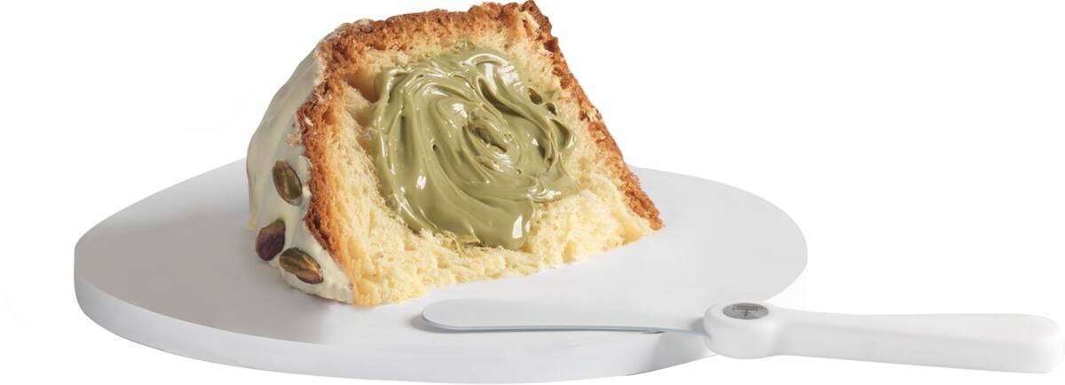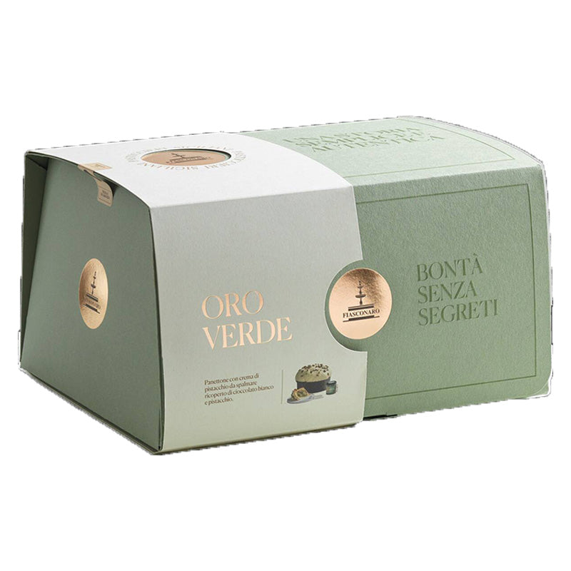 Il Panettone Oro Verde è ricoperto da uno strato di cioccolato bianco e pezzi di pistacchio. Viene fornito con un vasetto di crema al pistacchio e un pratico coltellino per applicare la crema sul panettone.