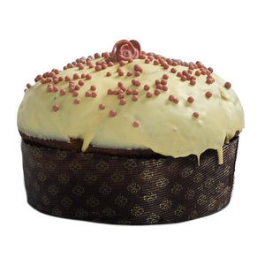 147001KAPanettone mit Rosenblütenessenz und rosa Schokoladenstückchen, bedeckt mit Kaktusfeigen-Konfitüre, weisser Schokolade und Schokoladenkrokants.