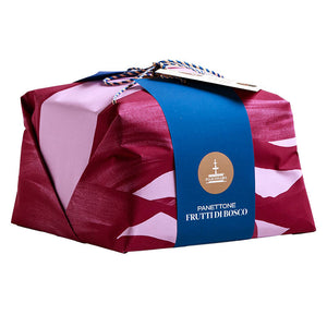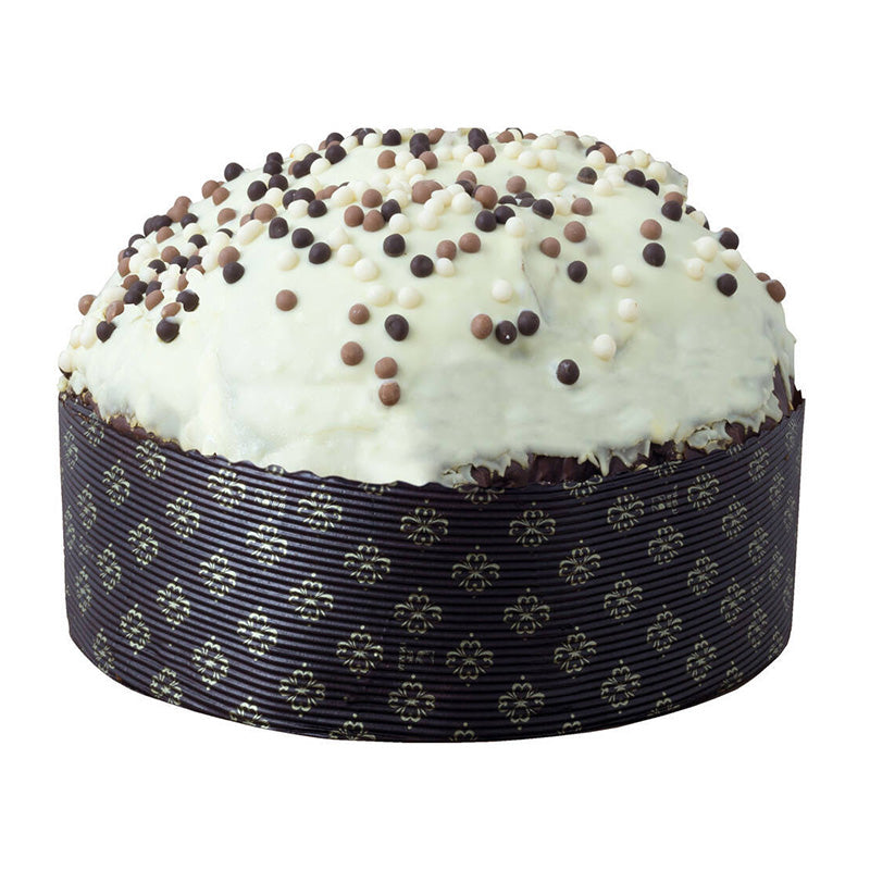 Panettone mit halbkandierten Waldfrüchten, überzogen mit weisser Schokolade und Schokoladenperlen.