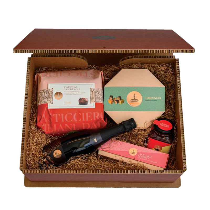 La confezione regalo contiene: Panettone Tradizionale 1Kg, Cubaita scatola 180g, Confettura Fragole & Arance 360g, Torroncini scatola 250g, Spumante Classico Brut 75cl.