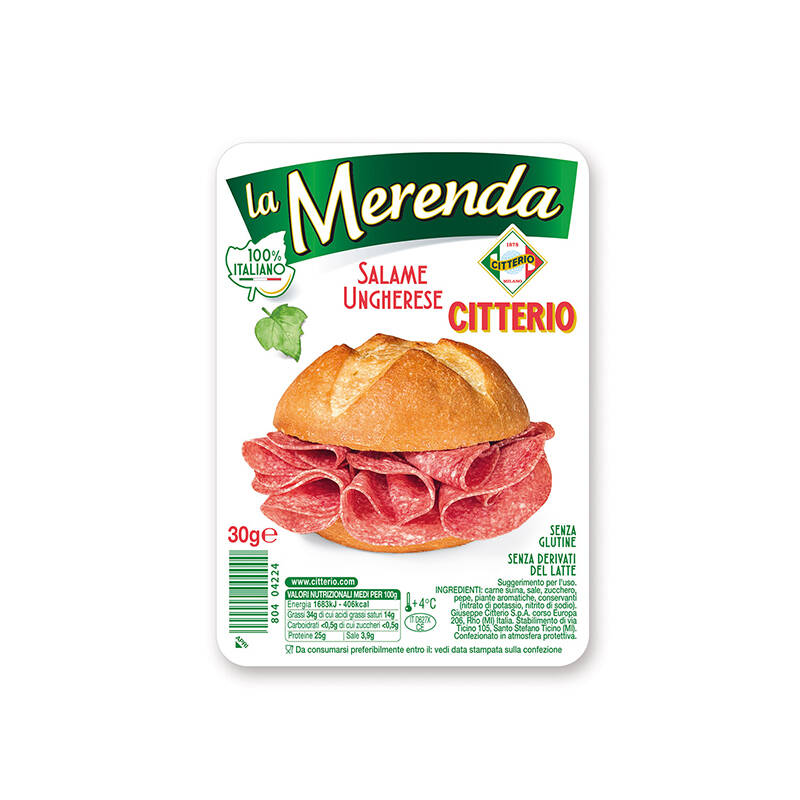 Il Salame Ungherese, una delle specialità di Casa Citterio, è caratterizzato da una grana molto fine e da un sapore leggermente affumicato. Affettati e confezionati in vaschetta monodose da 30 g.