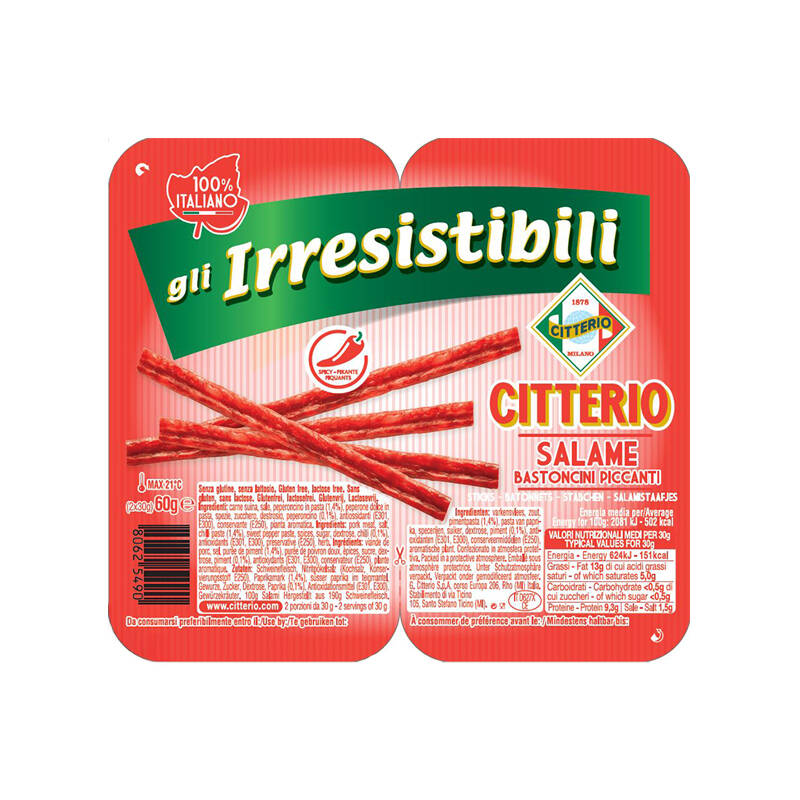 Die pikanten Salami-Sticks sind die perfekte Kombination aus Delikatesse und italienischer Tradition. Die praktische 2x30g Verpackung macht sie für jede Gelegenheit geeignet.