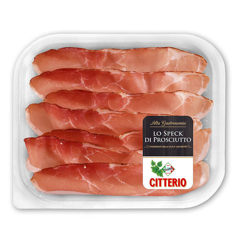 Lo Speck Alto Adige IGP di Citterio viene prodotto a Soprabolzano, a 1220 metri di altitudine. Gli ingredienti della sua perfezione sono l'affumicatura naturale con legno di faggio, l'attento dosaggio delle spezie e la stagionatura per almeno 8 mesi all'aria fresca delle valli altoatesine. Molte fette sottili nella pratica vaschetta.