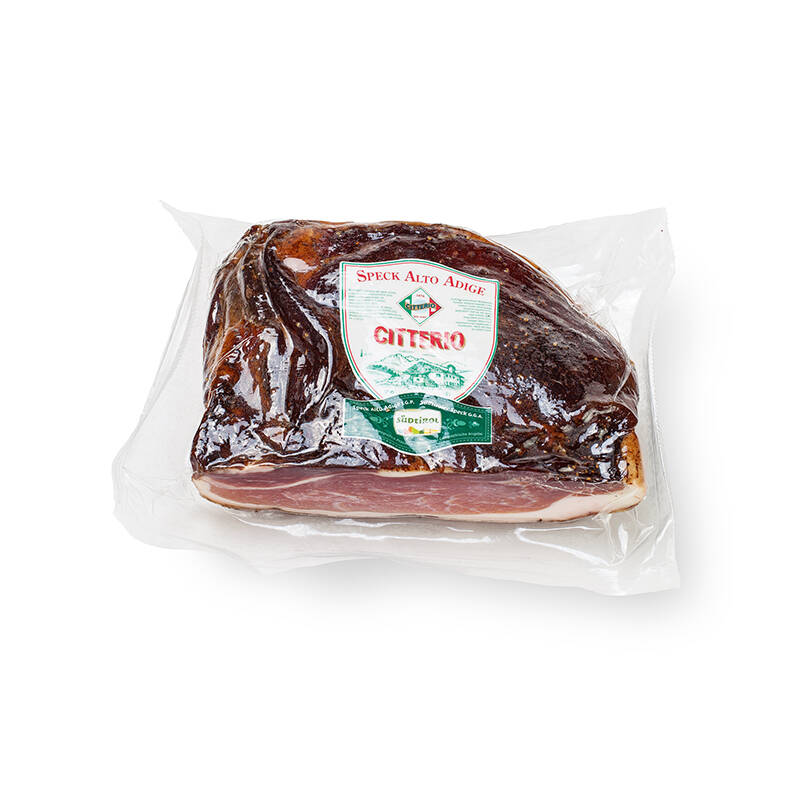 Dal profumo soave e ricco, lo Speck Alto Adige IGP di Citterio viene prodotto a Soprabolzano a ben 1220mt di quota. Gli ingredienti per la sua perfetta realizzazione sono l'affumicatura naturale con legno di faggio, un attento dosaggio delle spezie e la stagionatura di almeno 6 mesi all'aria fresca delle valli sudtirolesi.