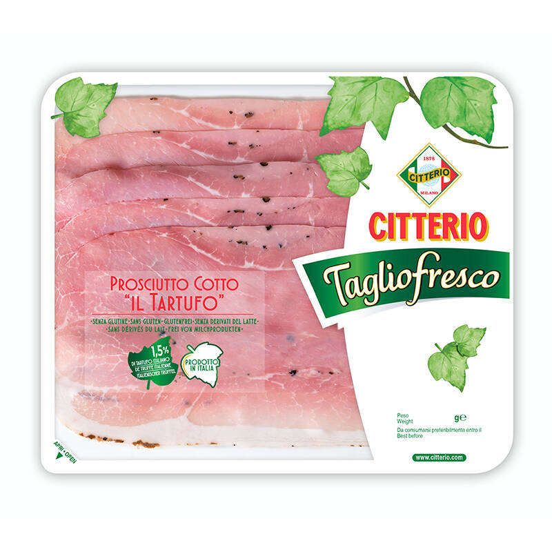 Prosciutto cotto di alta qualità per veri buongustai, con tartufo italiano. Molte fette nella pratica vaschetta.