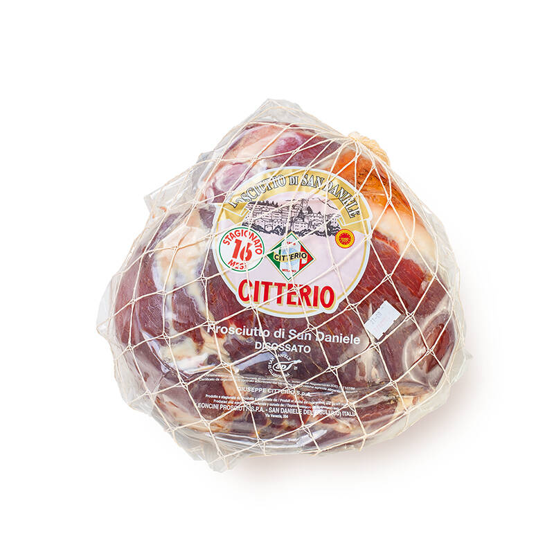 Ce n'est qu'après un long processus de sélection qu'un jambon devient un Prosciutto di San Daniele DOP. Uniquement cuisse de porc italienne et sel, ainsi que beaucoup de soin et de passion sont les seuls ingrédients de sa production. Les maîtres charcutiers de Citterio suivent ensuite la maturation de chaque jambon dans l'établissement de San Daniele pendant plus de 16 mois. Version "Pelatello" sans couenne.