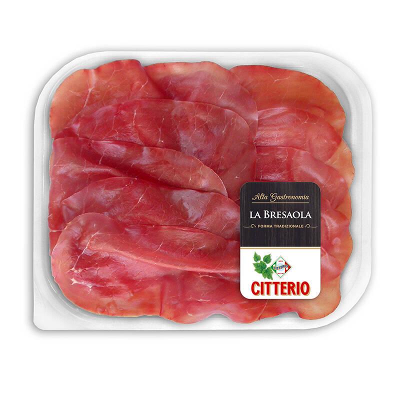 La bresaola Valtellina IGP de Citterio a un goût prononcé, une couleur rouge et une valeur nutritive élevée avec seulement 2% de matières grasses. L'air des vallées de la Valtellina crée les conditions idéales pour la maturation du produit. De nombreuses tranches fines dans une barquette pratique.